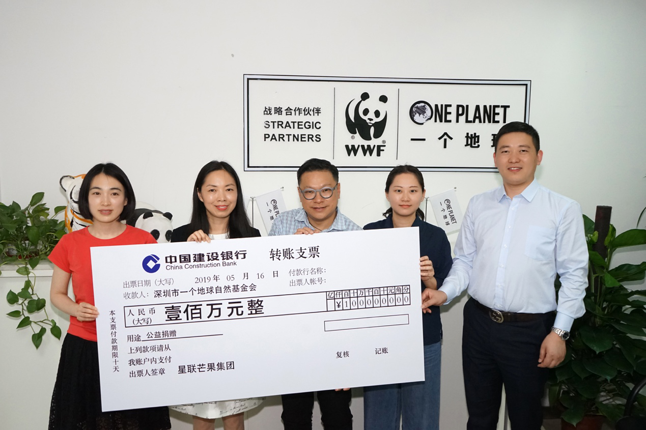 5月16日下午,星聯(lián)芒果集團向一個地球自然基金會捐資100萬元,攜手共創(chuàng)人與自然和諧相處的美好未來。星聯(lián)芒果集團副董事長郝伊凝女士、營銷總監(jiān)任福祥先生與一個地球自然基金會秘書長羅媛楠女士、世界自然基金會(瑞士)北京代表處首席代表盧思騁先生、首席運營官盧倫燕女士,共同參加了此次捐贈儀式。