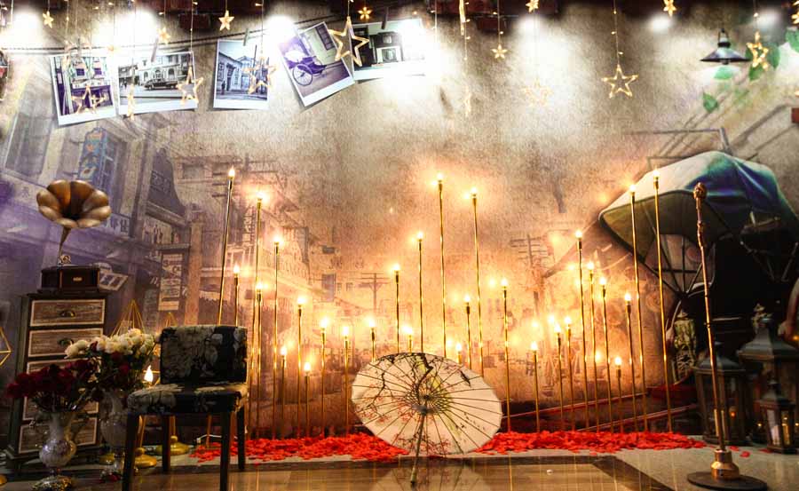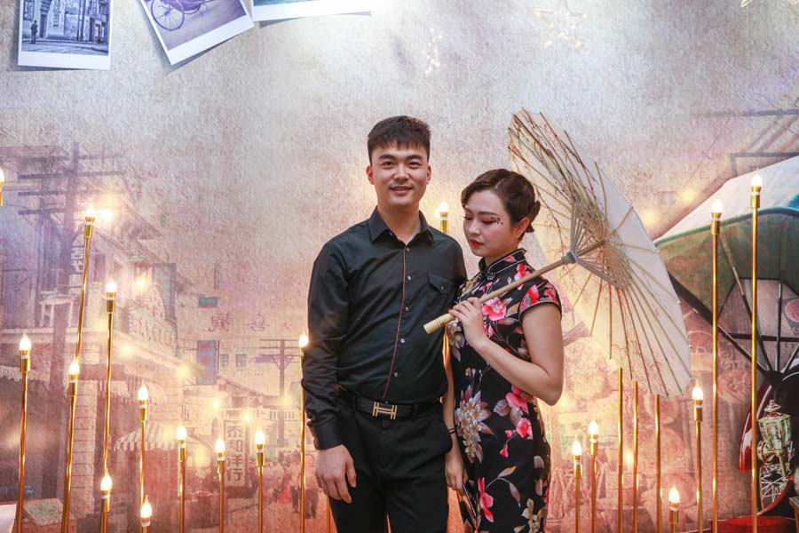 下午5時,雅文大酒店一樓門庭若市,人頭攢動,氣氛異常熱烈!一進門,別致的星星簽到墻映入眼簾,再轉身,璀璨星光浪漫滿屋,舊照片,留聲機,油紙傘,民國金曲……老上海style撲面而來。旗袍美人笑語娉婷,西裝革履英姿颯爽,好一派十里洋場美如畫!