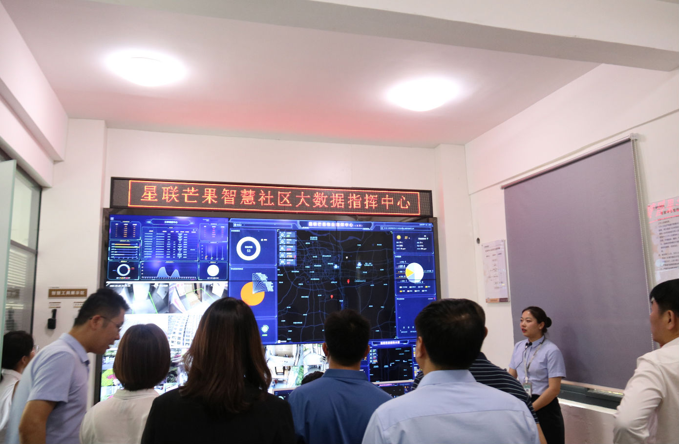 星聯智慧社區指揮中心, 位于星聯芒果物業在管省級示范住宅項目—和郡,該小區作為河南首家5G智慧社區,通過智能化人臉識別、智能梯控、周界安防報警、家庭安防聯動、智能通行服務、防摔檢測、高空拋物監控等系統,打造數字化、智慧化社區管理平臺,通過項目“數據大屏”的演示,展示智慧管理的服務方式,實現多場景、多維度、多模式的生活服務,全面提升業主幸福居家指數。