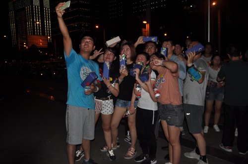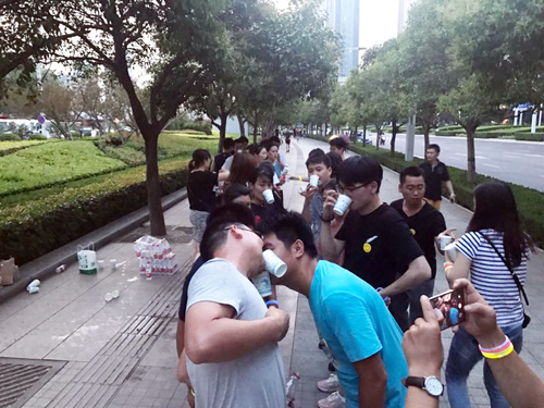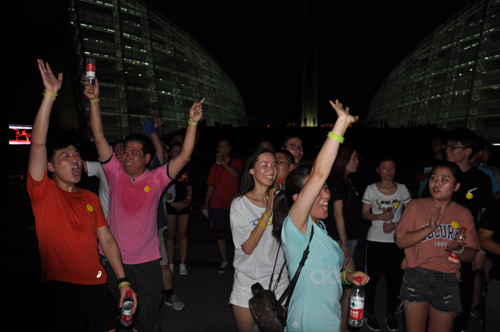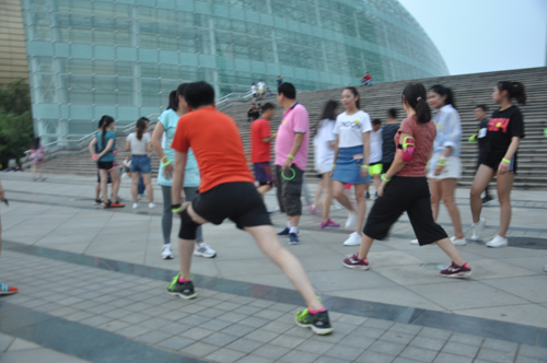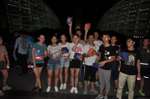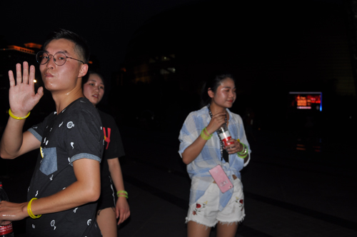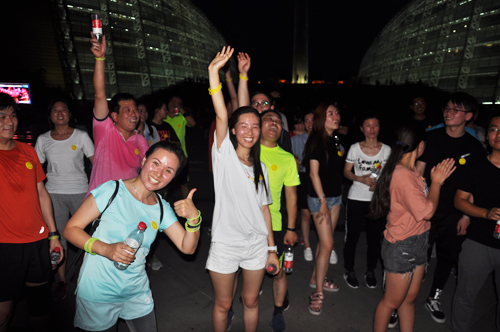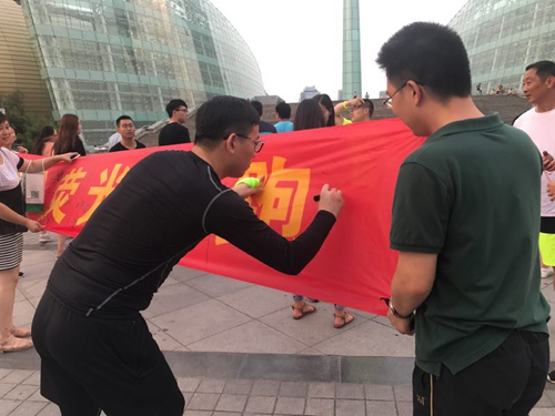 結束一天緊張工作,小伙伴們齊聚河南藝術中心廣場, 紛紛在條幅上簽下自己的名字。一番熱身運動過后,已是華燈初上。大家佩戴上不同顏色的熒光棒,開始蓄勢待發(fā)。